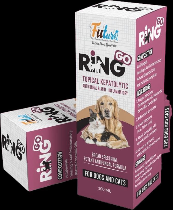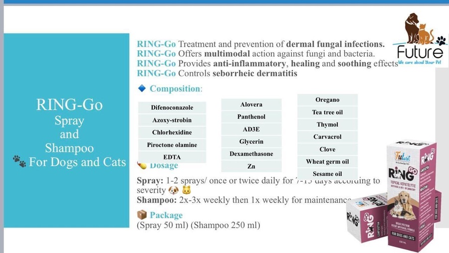 Ring Go Spray 100ml is a topical veterinary solution specially formulated for dogs and cats to treat common skin conditions such as fungal infections, irritation, and inflammation. This advanced formula combines keratolytic, antifungal, and anti-inflammatory properties to promote faster healing and restore healthy skin.