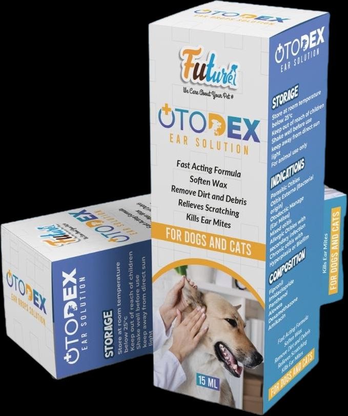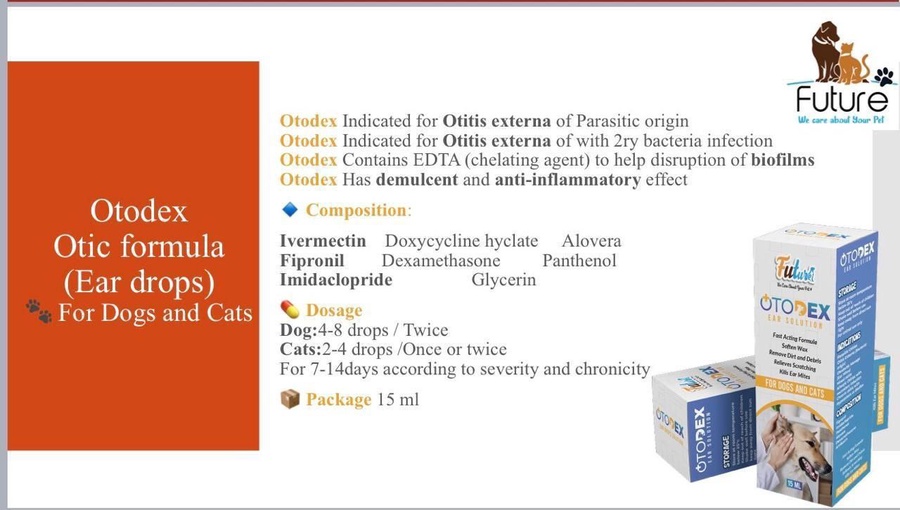 محلول أذن Otodex 15ml ear solution يعالج قراد الأذن و otodectic mange للكلاب والقطط، يقلل الحكة ويحسن صحة الأذن.